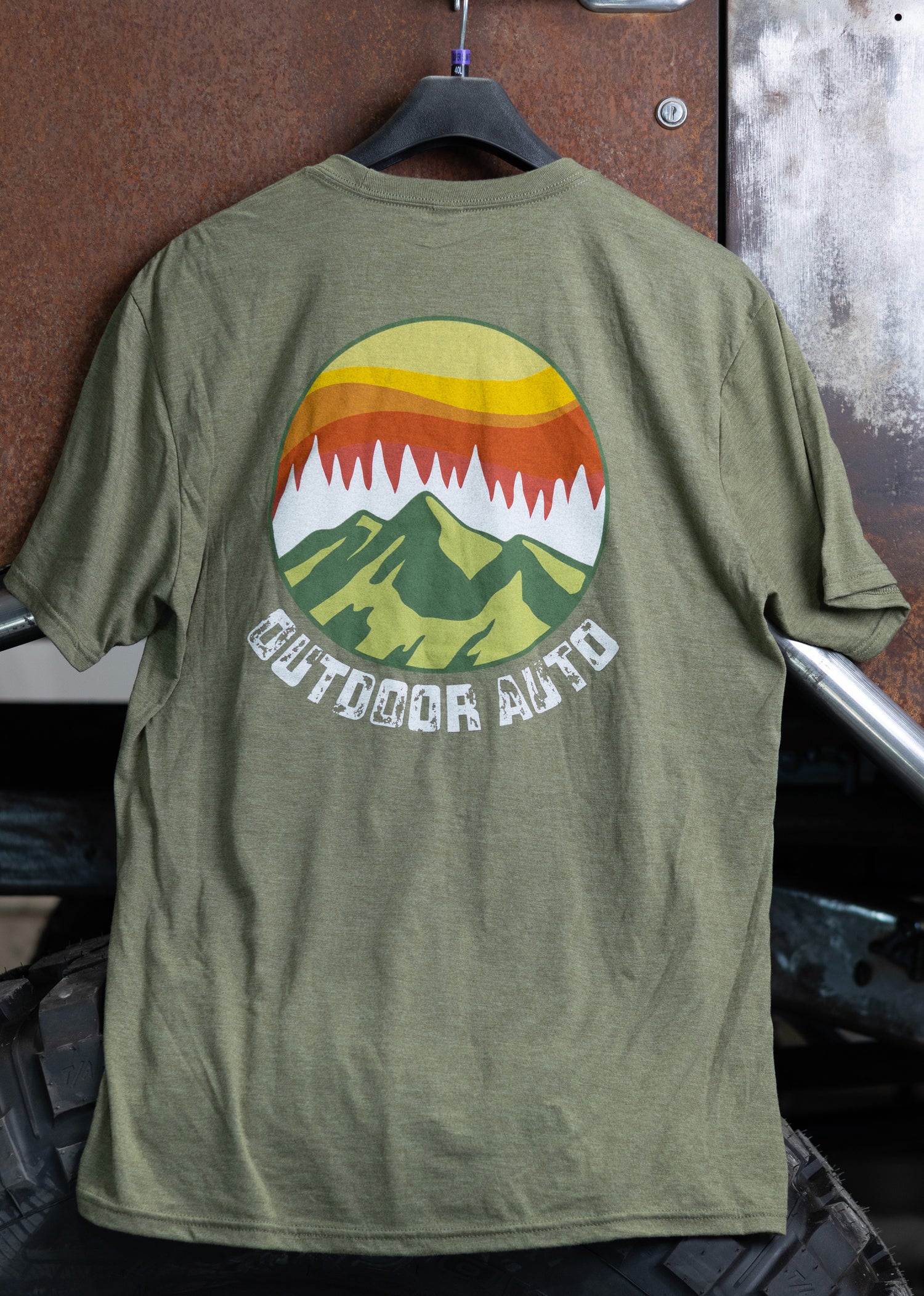 A collection of Outdoor Auto shirts and sweatshirts.